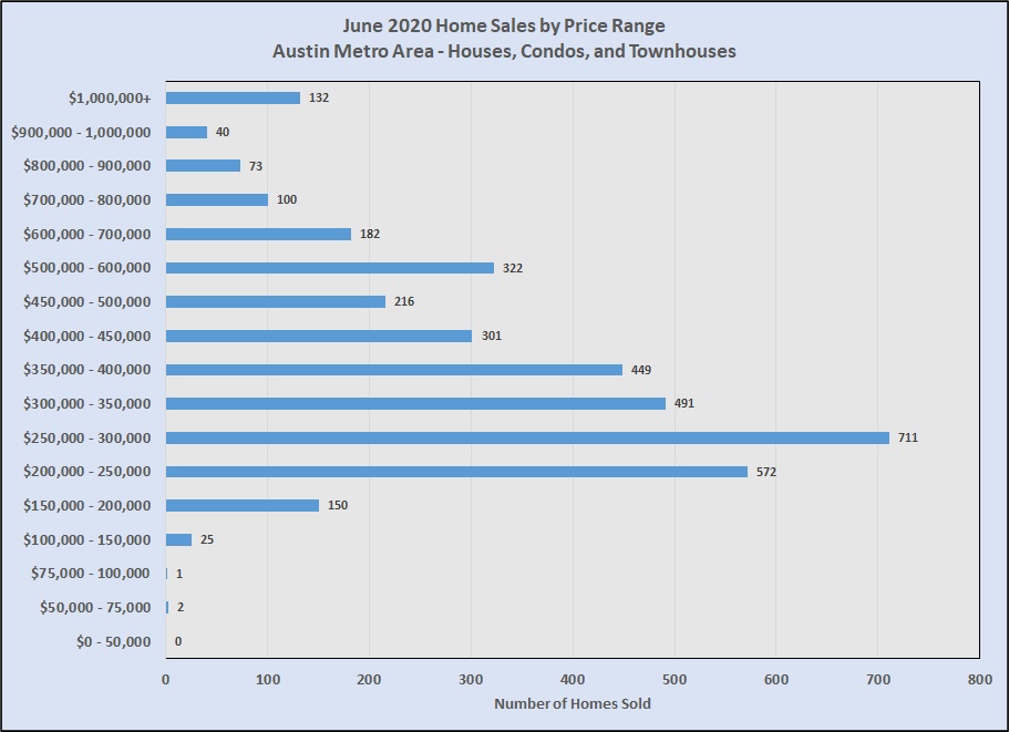 About 47% of all sales in June 2020 sold between $200,000 and $350,000, with 60% being between $200,000 and $400,000.