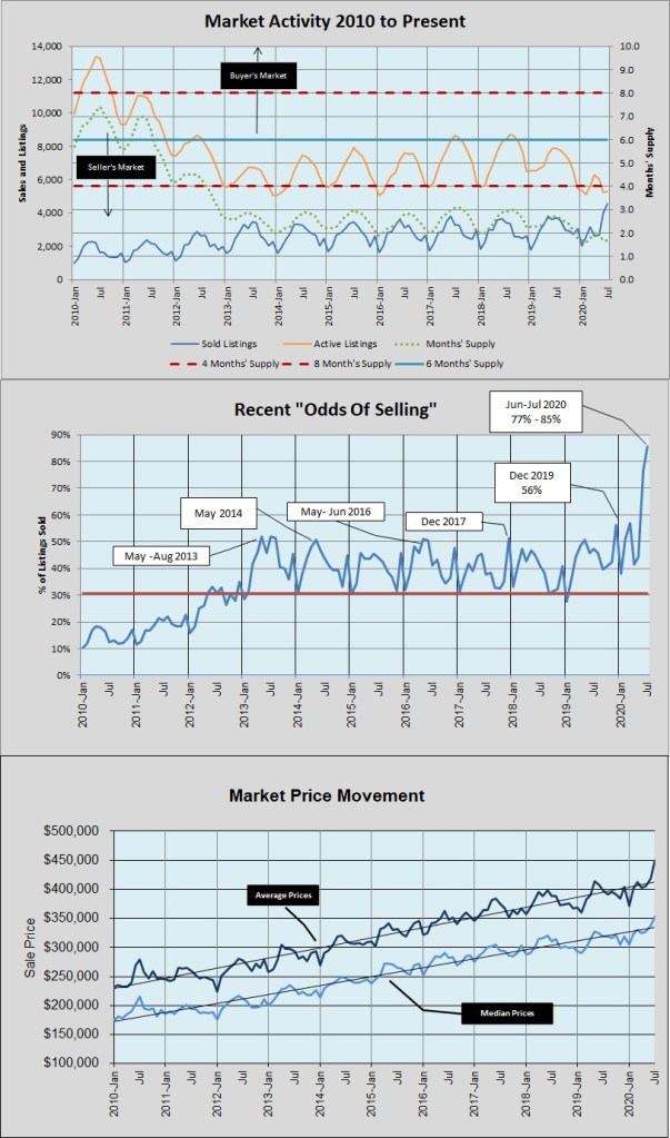 Look first at the “Odds of Selling” chart in the middle and notice the percentage of active listings sold in June and July — 77% and 85% respectively. December 2019 was the highest point ever for this metric until this summer, but that record has been retired now!