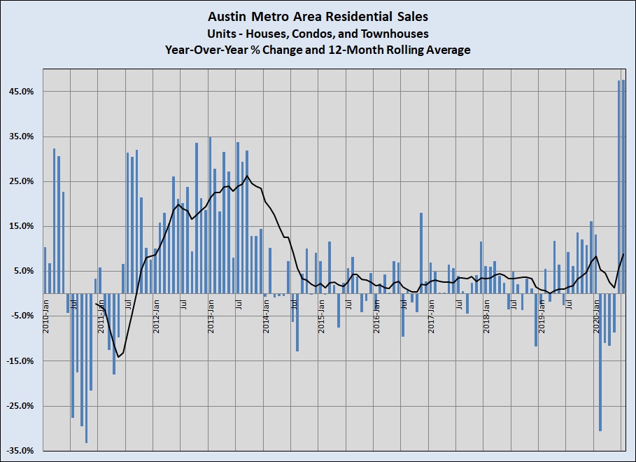 If you see bars showing sales 47.5% higher in June and July than the same months last year, it’s not your imagination. Even during the first three years of this incredibly long market cycle, the pace of unit sales peaked at 35% year-over-year growth. It’s also worth noticing how volatile the eleven months were leading up to the June-July spike. I have been telling you for a long time that our market is supply-constrained, but as we began to open much of the economy, demand overpowered the effect of limited inventory.