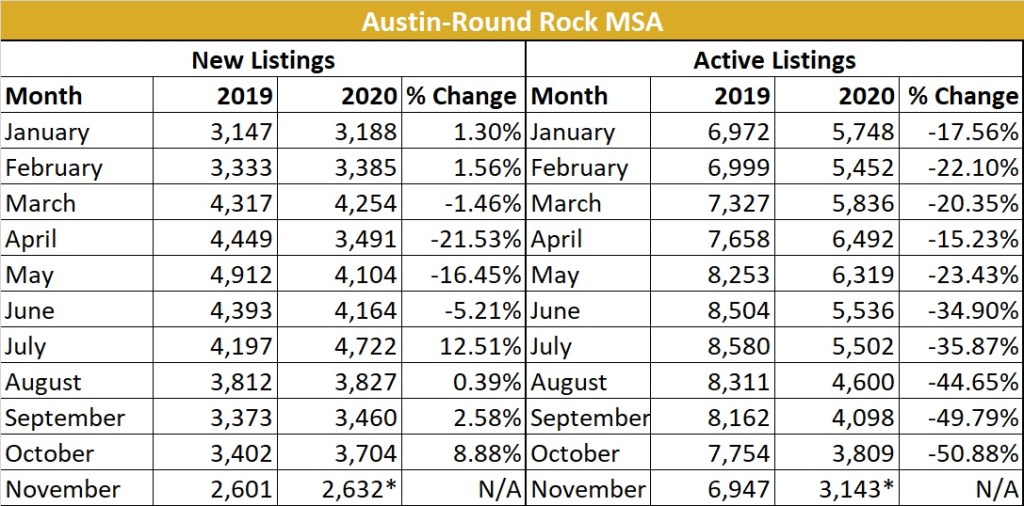 The number of monthly new listings in 2020 grew slightly in January and February, then declined from 2019 in March through June. The only meaningful year-over-year increases in new listings were in July and October (with November still incomplete). Look at the % Change column under Active Listings, though — down every month this year, with the decline in inventory accelerating for most of the year.