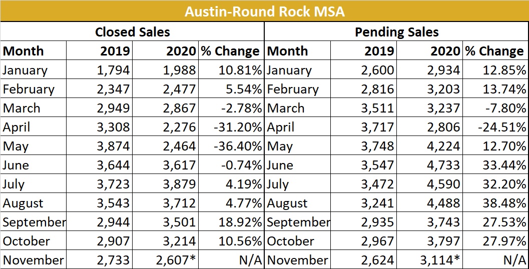 Closed sales dipped in March, April, and May, in the early days of the pandemic, and we haven’t completely made up for those months. We saw declines in listings, sales, and pending sales in the week that included the Thanksgiving holiday, but the number of pending sales near the end of November is up from 2019. We can expect a pause around our December holidays, but there really is no sign of softening housing demand. Onward to 2021!