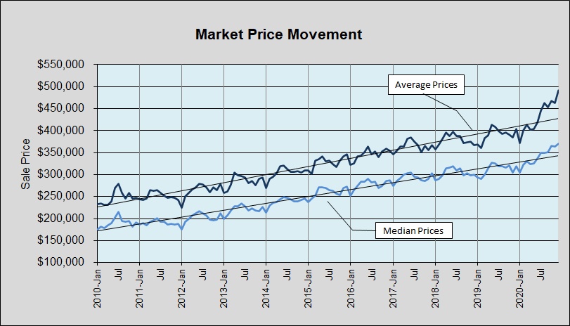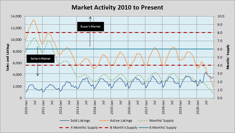 The dotted green line in that chart is very important. It shows how long the supply of homes each month will last at the current level of demand. Historically, market economists have considered 6 to 6 1/2 months’ supply to be “balanced” — i.e., a market environment in which neither buyers nor sellers have a built-in advantage market-wide. For most of this market cycle, our metro area has carried between 2 and 3 months’ supply, dipping below 2 only once, in 2016. Then, Months’ Supply fell below 2 months in December 2019 through March 2020, recovering briefly at the beginning of the coronavirus pandemic, and then tumbling for the rest of the year, ending at 0.9 and 0.6 month’s supply in November and December, respectively. [Put that into perspective: 0.6 x 30 days = 18 days … the expected life of a new listing across our metro area.]
