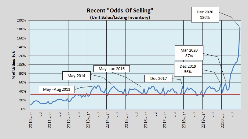 The ratio of residential sales to listings over the past thirty years was 26%. The Austin residential real estate market transitioned from the last market bottom in 2012 into the current market cycle, and the ratio of sales to listings from 2013 through 2019 was 41%. That average in 2020 was 82%!!!! (And note that unit sales exceeded average listing inventory for the last four months of the year — i.e., there were more sales than new listings every month.)
