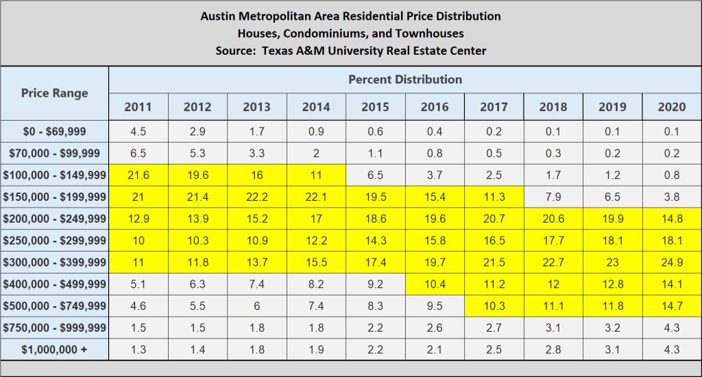 With that background, the distribution of home sales has migrated toward higher price ranges. The table shows the percentage of sales over the past 10 years by price, with price ranges that represented at least 10% of total sales highlighted each year: