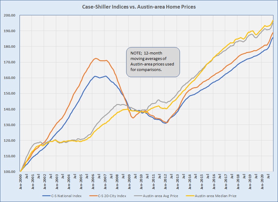The newly available Case-Shiller data uses 2000 as the index year. Using 12-month rolling averages of monthly average and median prices for the Austin metropolitan area, also indexed to 2000, you can see that our prices have risen more during the past two decades than Case-Shiller’s National and 20-City indices: