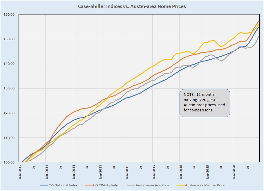 All four data sets declined during the 1st quarter of 2012, so you see them emerging at the bottom of the graph around March of 2012. The index of Austin-area average home prices actually stayed slightly lower than the 20-City Case-Shiller index through all nine years, while the index of our median prices was above that Case-Shiller index from 2015 through 2020. But notice that both Case-Shiller indices and Austin median prices are clustered very tightly at the end of 2020, with the average price index for the Austin area below all three. Using rolling averages of Austin prices smooths seasonal ups and downs, but it also obscures really shocking price growth over the past three months. The shortage of available housing is a significant factor in most U.S. metros, though, and I am confident that the comparisons discussed here are valid.