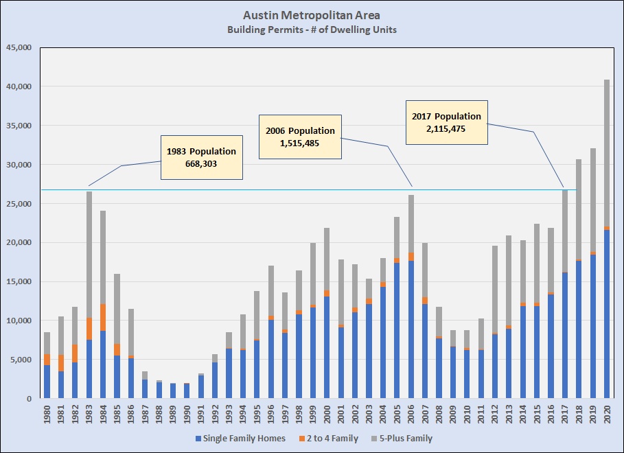 It’s important to note that in the early 1980s, the city of Austin represented a very large part of the population and job market across what is now a metropolitan area. In that context it’s important to recognize that Austin adopted its current land develoment code in 1983. It isn’t coincidental that construction of “missing middle” housing peaked in 1983 and 1984. The reason is that the 1983 code largely blocked construction of anything other than single family homes. After more than 30 years of amendments the code is much more complicated and confusing, and sometimes even self-contradictory, but it is still very hard to build anything between single family and large multiple family projects, with the large projects almost always permitted as Planned Unit Developments or other special exceptions to code requirements.