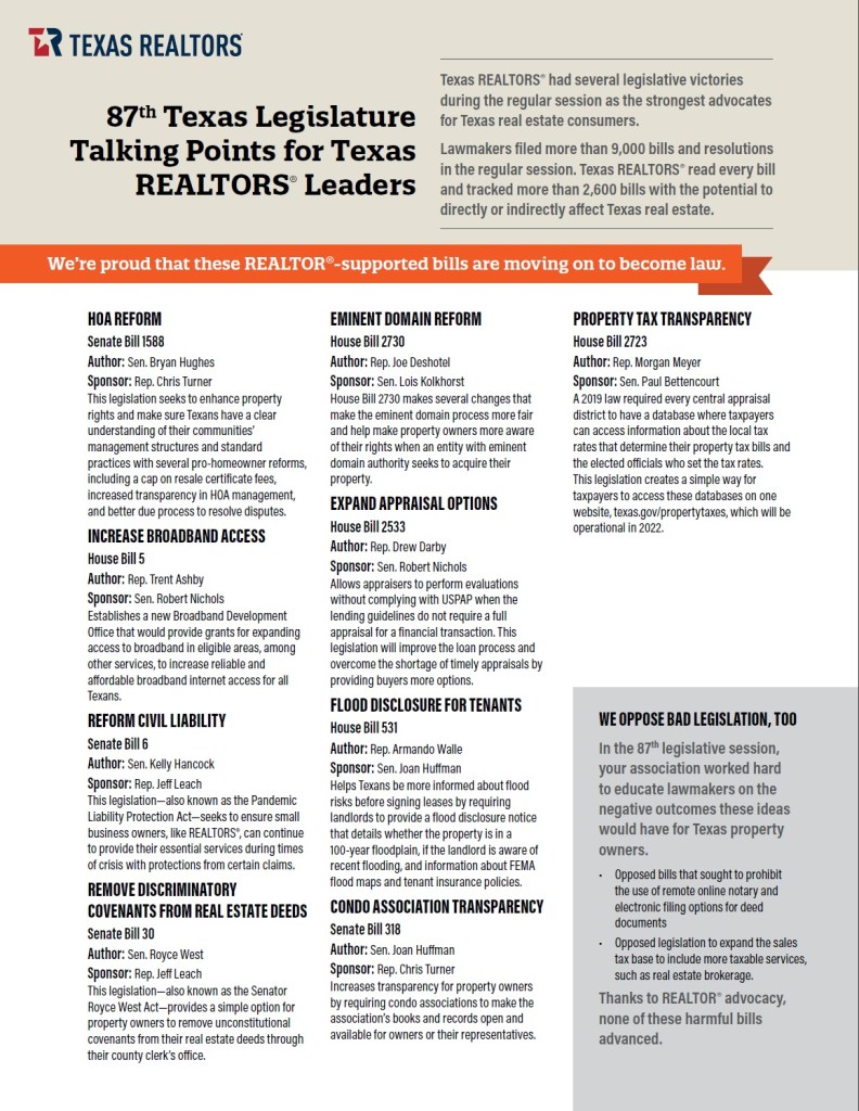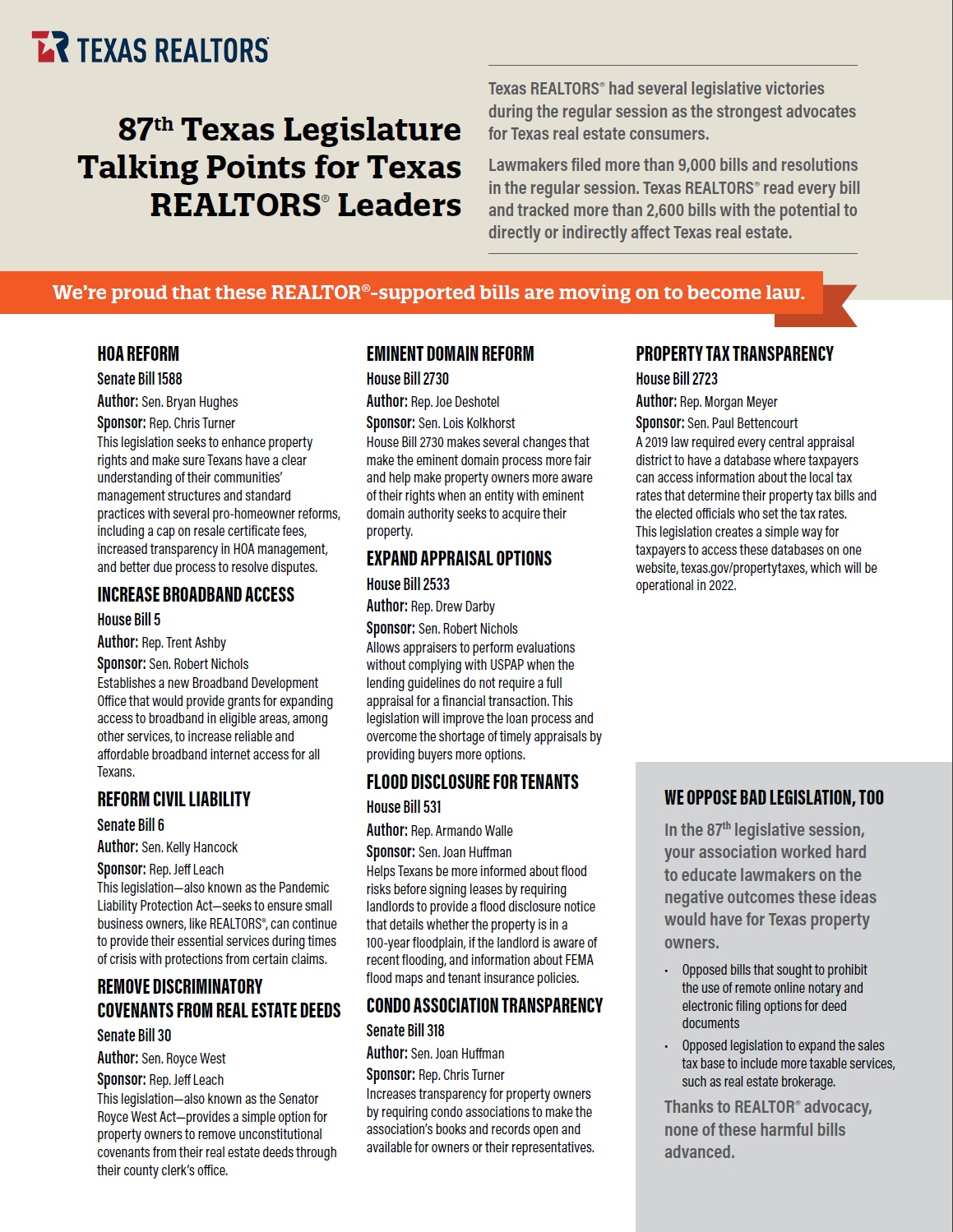 I have been involved with government affairs and policy advocacy for many years: I chaired policy teams working on Water Issues, Land Use, and Property Rights, chaired the Legislative Management Team at the Austin Board of REALTORS® in 2015 and 2019, spoke many times at City Council meetings and separately with council members and the mayor, and was part of presentations to legislators at the state and federal levels. During the 2021 Texas legislative session, I was especially proud to support Texas REALTORS® efforts and to champion several successful bills that benefit property owners in Texas tremendously. Here’s a summary of the big ones:
