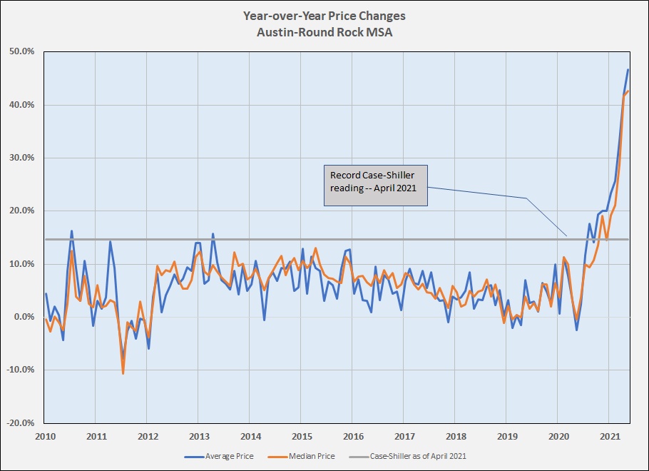 The important difference, though, is the magnitude of the sharp upturn over the past year. To make that easier to see, I added a gray horizontal line on the Austin price graph, showing the 14.6% Case-Shiller highest-ever reading. Note that home prices in the Austin MSA passed that pace of change many months ago. “Truly extraordinary” is an apt description of the Case-Shiller numbers. Pick your own adjective to describe what has happened in Austin, with median and average prices in April up 42% from a year earlier, and with the average sale price in May 2021 up 46.6% compared to May 2020! (For comparison to the monthly changes shown above, the median sale price in the Austin area was up 9.9% from February to March, and 8.24% from March to April. It was slower in May, but that’s a subject for another post.)