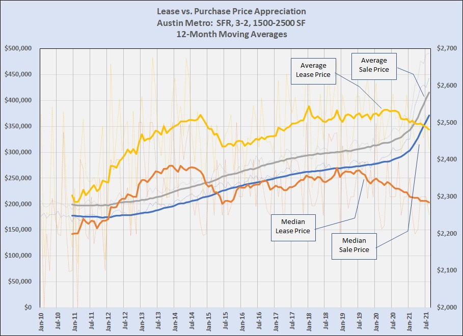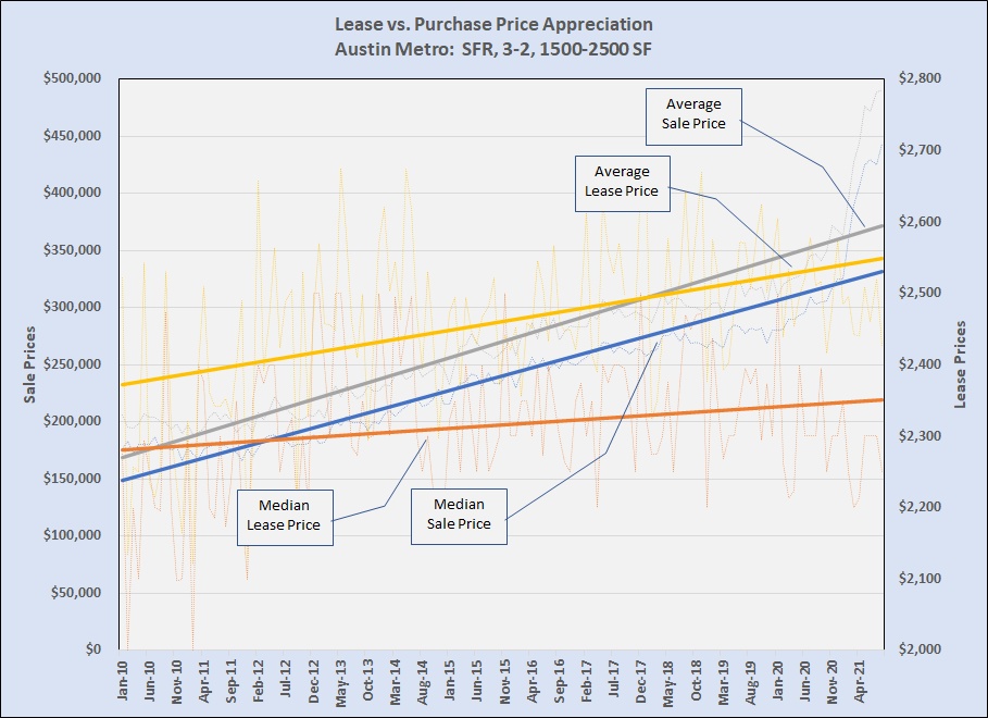 Over the past couple of years I have written about the vast difference between price escalation in the for-sale and the for-lease segments of our housing market. (Investing in Austin real estate, August 2019 and Investing in Austin?, July 2020). Using trendlines and moving averages, those posts showed that rent increases have not kept up with sale price increases. That has challenged new investors, and the gap has become vastly more challenging in 2021.