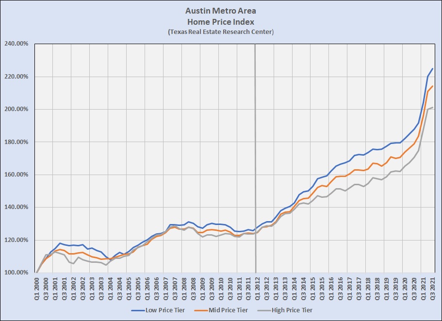 The Texas Real Estate Research Center at Texas A&M University provides some great tools. One of those is the Home Price Index. Below is a look at that data for alsmot 21 years: