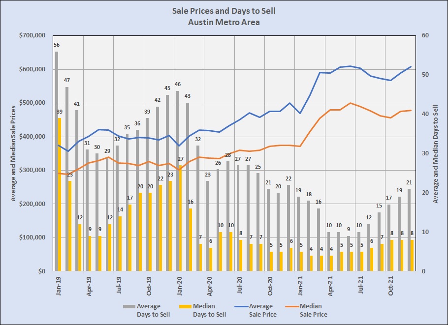 A few days before Christmas I posted Changes to Watch, with a preliminary look at two metrics that succinctly show what Austin-area resale home sellers and buyers experienced last year. Now that 2021 is over and December closings are all reported, I have assembled a more complete look at home prices and market velocity over the past three years: