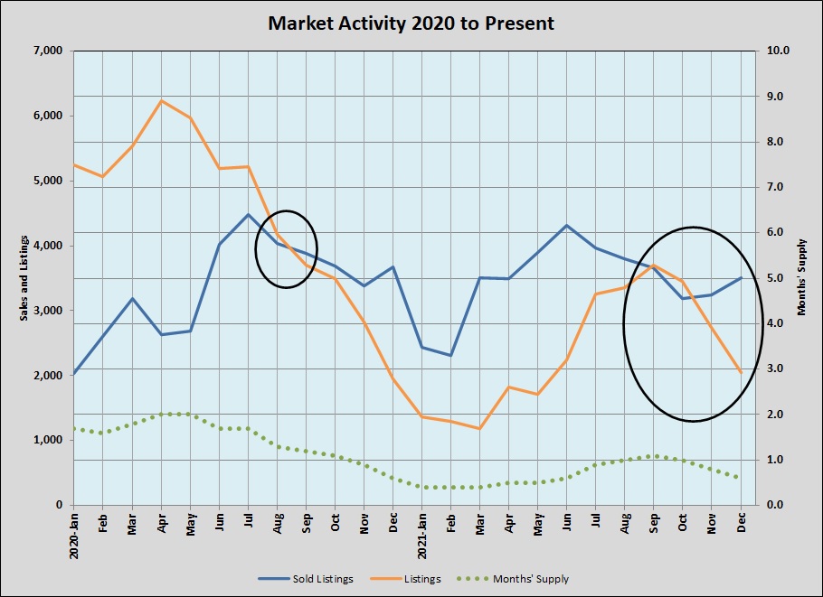 The circled areas of that graph highlight the key issue, showing that in September 2020 we sold more homes than we listed. In September and October of 2021 that condition changed briefly and in a very small way, but look at November and December of 2021!