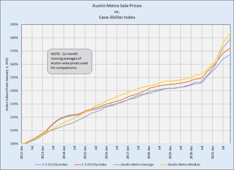 You can see that for most of that 10-year period, the slope of price growth in the Austin area and in the aggregated Case-Shiller cities were generally parallel, although pace of change in Austin’s average prices surpassed both the 10- and 20-city Case-Shiller indices. The pace of change diverged in 2022, with both average and median price growth in the Austin area exceeding the Case-Shiller cities. (I commented on that about several months ago in another comparison with the Case-Shiller index — Austin Metro Prices vs. Case-Shiller.)