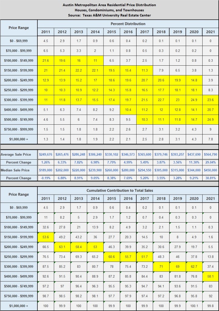 Earlier this week I updated my Market Dashboard, providing a detailed look at our ongoing supply-and-demand issues and the resulting impact on market velocity and sale prices (Quarterly update – Austin residential real estate). That post sets the stage for an annual update on the distribution of sales by price range across our metropolitan area. This chart says a lot: