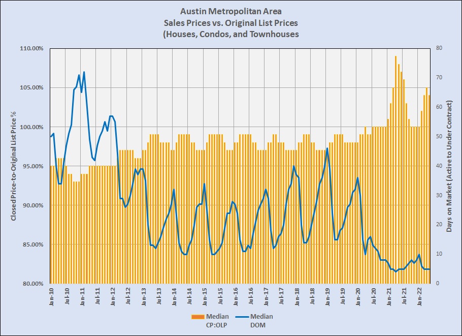 There was a flurry of activity in the first half of 2021, leading the median ratio of sales price to original list price to peak at 109% in April. We saw the same pattern so far in 2022, with the CP:OLP ratio peaking at 105% in April. Notice, though that the median time a sold home was on the market (Active to Under Contract) in March, April, and May of 2022 was still just 5 days, about the same as much of 2021.
