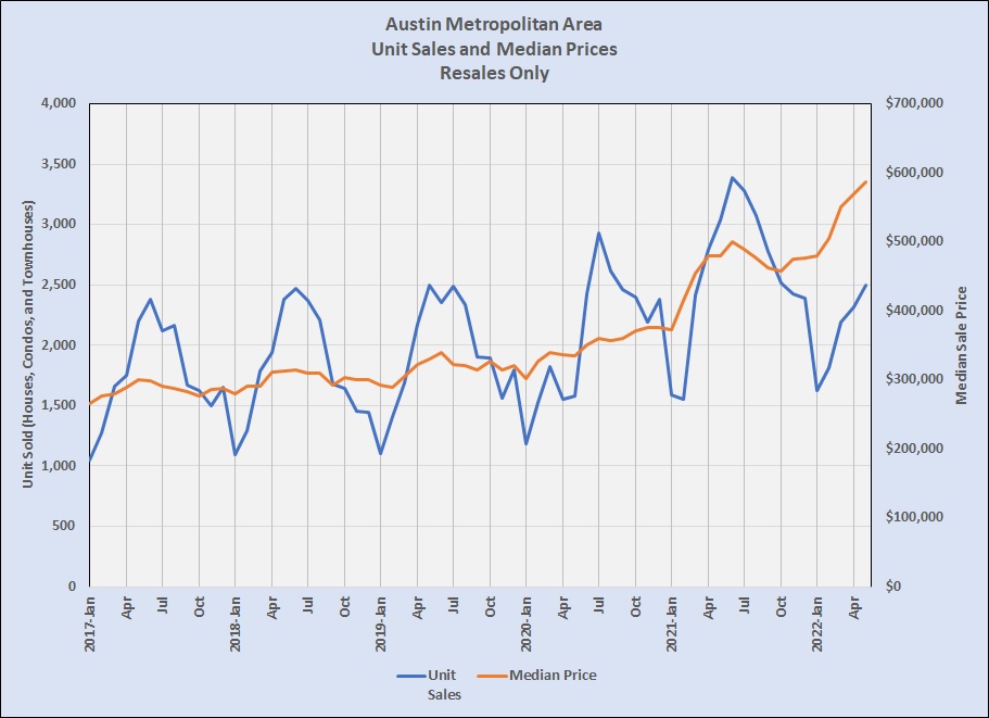Using MLS data, this chart shows the number of homes sold each month since 2017 and the monthly median sales prices: