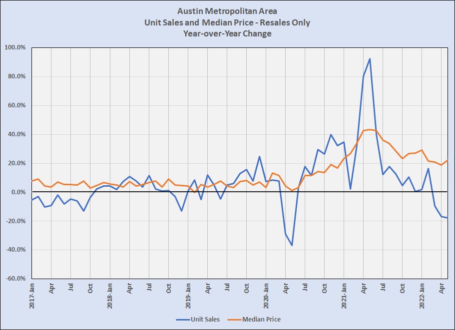 The dramatic increase Unit Sales in early 2021 is obvious, but the change from December 2020 to December 2021 was just 0.3%. More importantly for this discussion is the downward change in the number of homes sold between February and May of 2022 — to “negative growth” in March and ending May down 18% from a year earlier. The pace of Median Price growth slowed after the April-May-June 2021 frenzy and continued to decline gradually through April 2022.