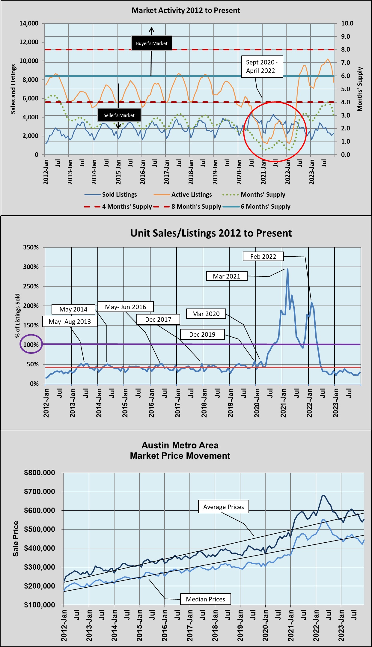 The important feature of the top chart (Market Activity) is the red circle, highlighting that between September 2020 and April 2022, more homes were sold than were listed acrose the 5-county Austin-Round Rock MSA. That extreme imbalance between supply and demand led to unprecedented inventory absorption shown in the second chart (Unit Sales/Listings), and that erosion of housing supply produced the dramatic price behavior shown in the bottom chart (Market Price Movement),