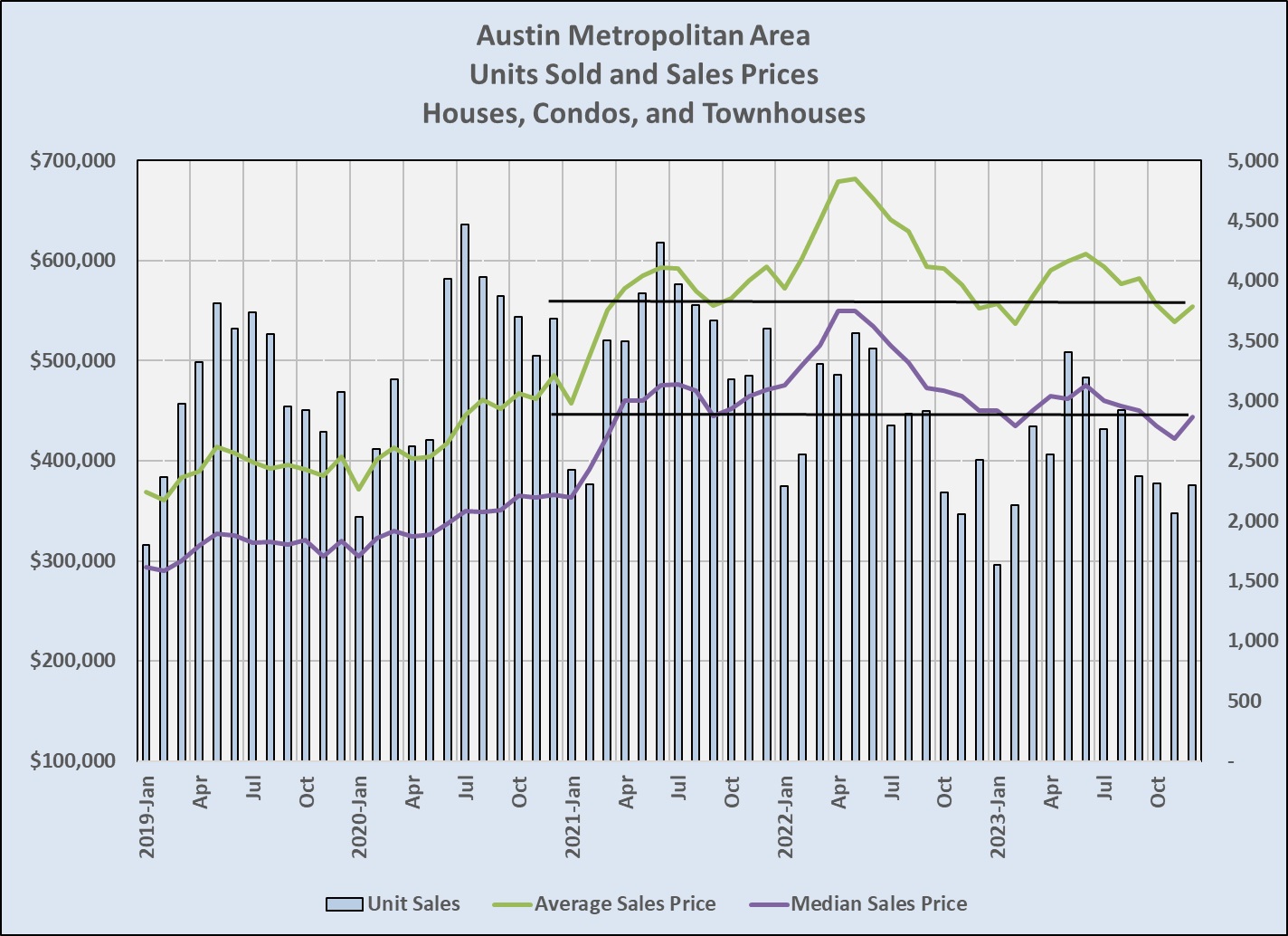 If you purchased a home in 2021 or 2022, you may well have negative equity in the property at this point, but most owners of residential properties in our metropolitan market gained substantially over the years shown. The horizontal black lines indicate the average and median sale prices in December 2023, which were about the same as February 2023, September 2021, and March-April of 2021. But the average and median prices in December 2023 were 50% higher than in January 2019, just five years earlier! (And had been rising steadily for six years before then.)