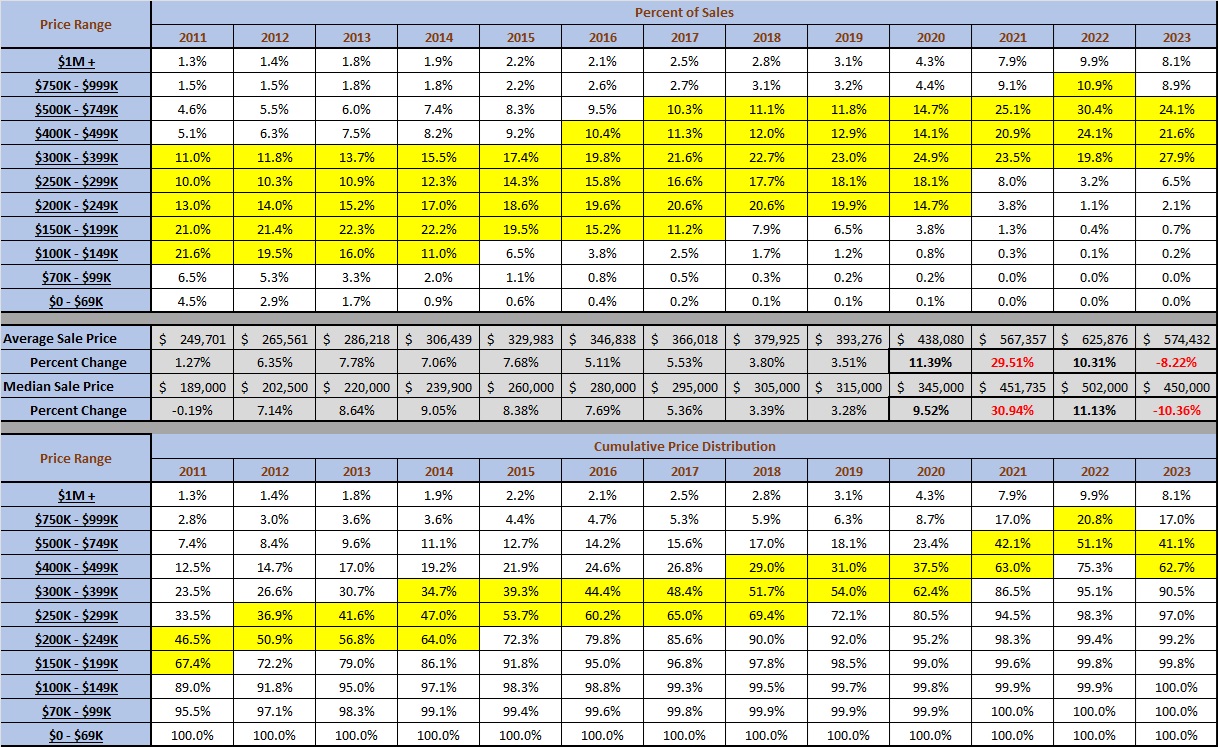 The bottom portion of the graphic shows the cumulative percentage of sales from the highest to the lowest price range, with the price ranges that included the median and average sale prices each year. In both the top and bottom grids it is evident that 2022 was an anomaly. The average and median prices and year-to-year changes shown in the gray rows in the middle of the graphic show that the most dramatic price changes actually happened in 2021, that 2022 was year of more moderate growth, and that 2023 saw falling prices compared to the previous year.