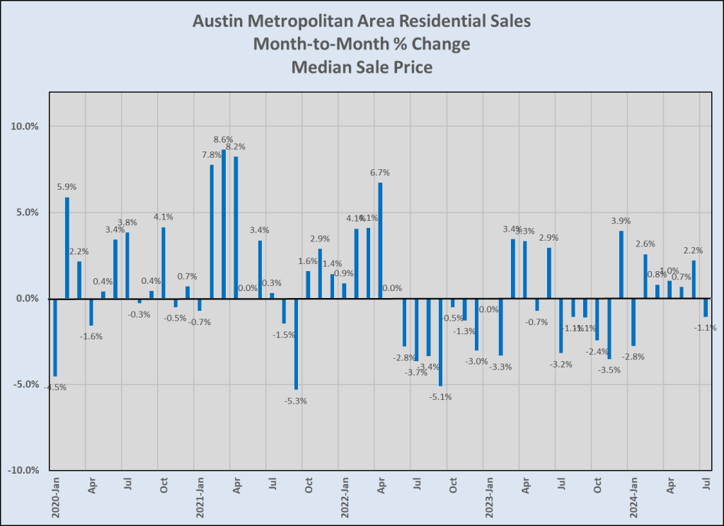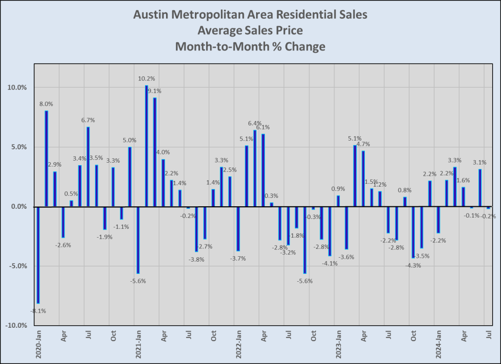 Average prices were down in 13 of the last 24 months, and up in 11. Median prices were down in 14 of the past 24 months. Both were down in July 2024 compared to June.