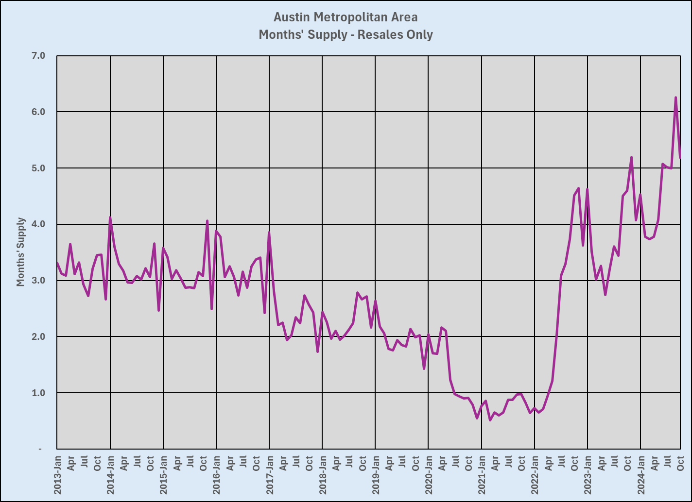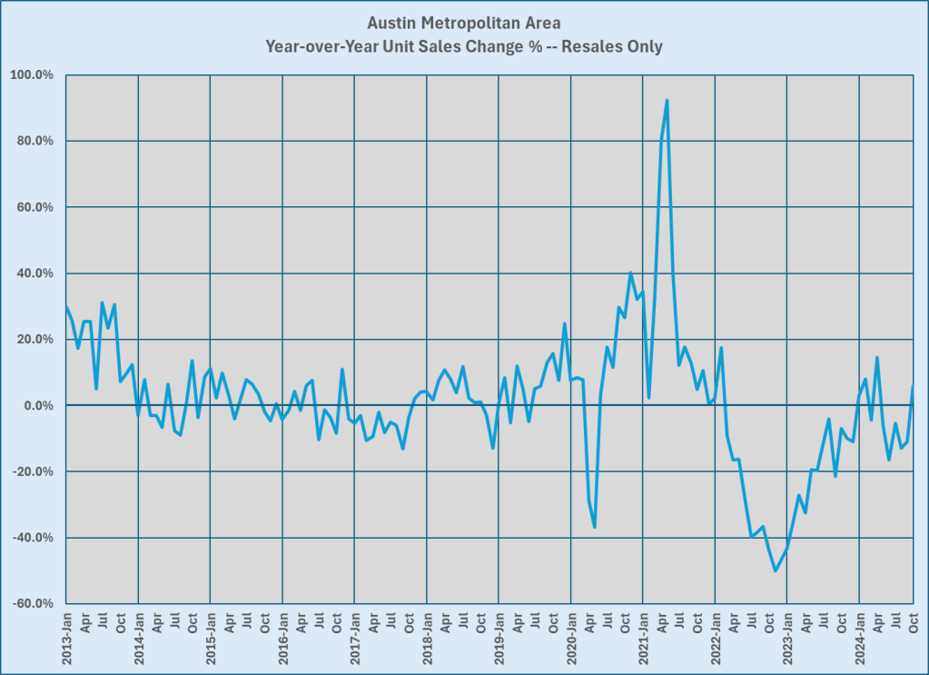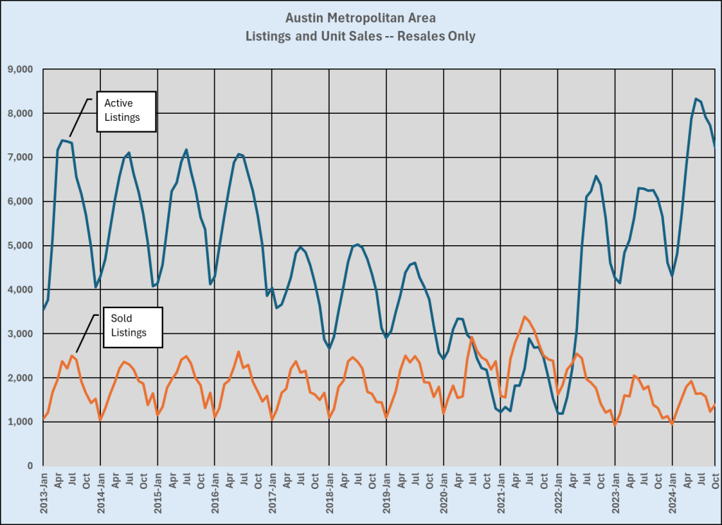 Unlike the price appreciation mentioned in the national statistics, the median price in the Austin metropolitan area in October 2024 was $429,500, down 1.4% compared to one year earlier. The last time the median price here was lower was in March 2021, just before the pandemic began. (Yes, the median in October 2024 was down 22% from the pandemic era peak, but was 10% higher than the price one month earlier, in February 2021, and the median over five years October 2019-October 2024 was up 34%, almost 7% annual appreciation if you owned your home for all of those years.)
