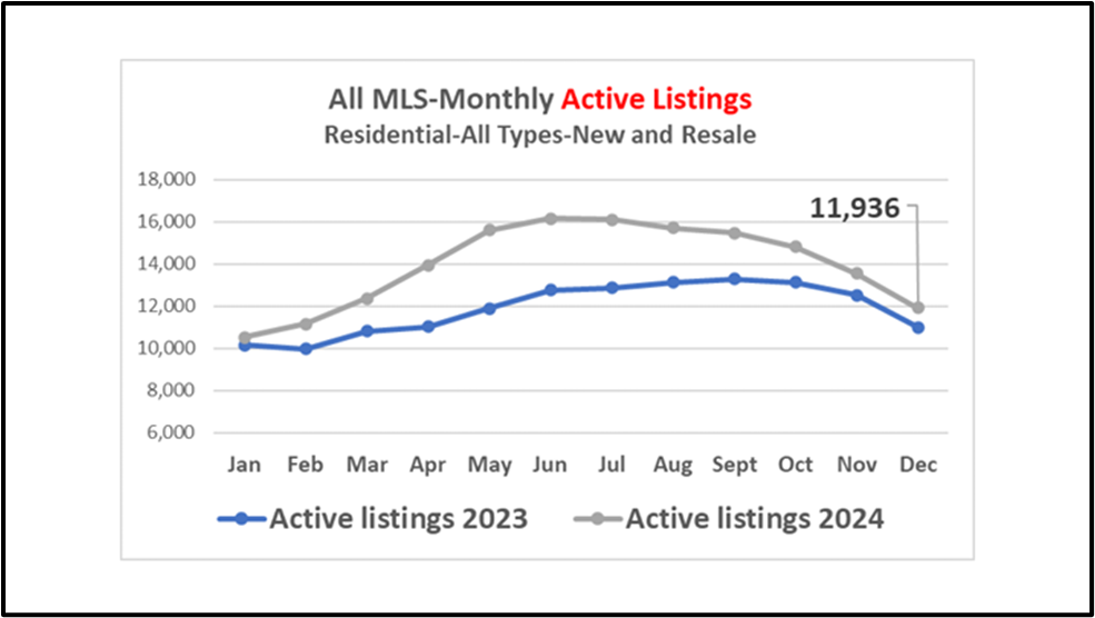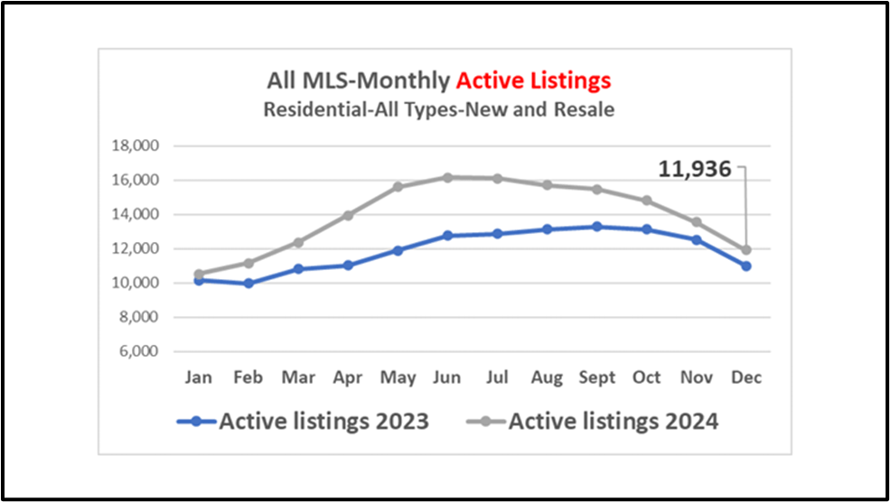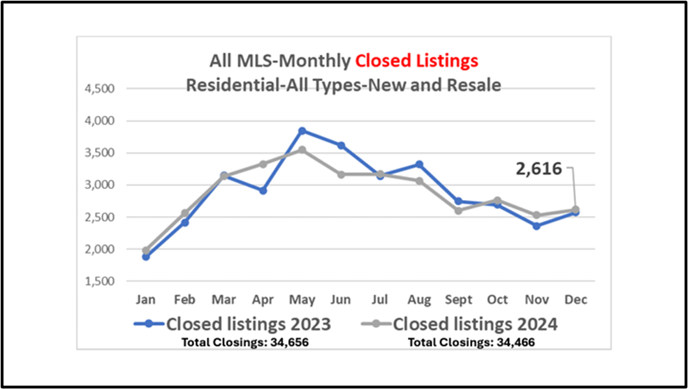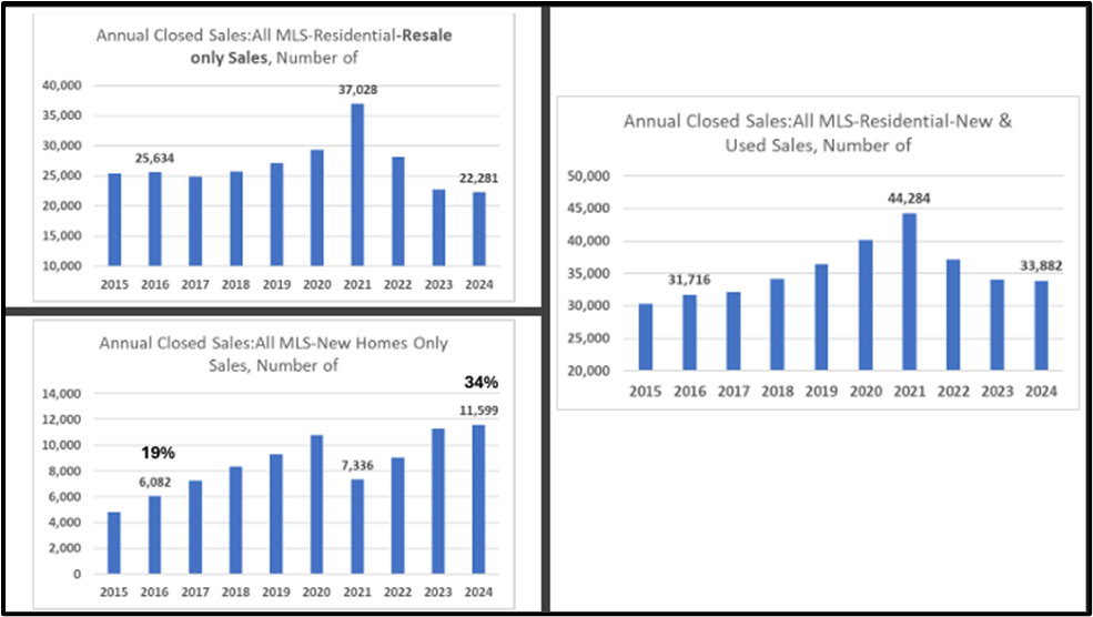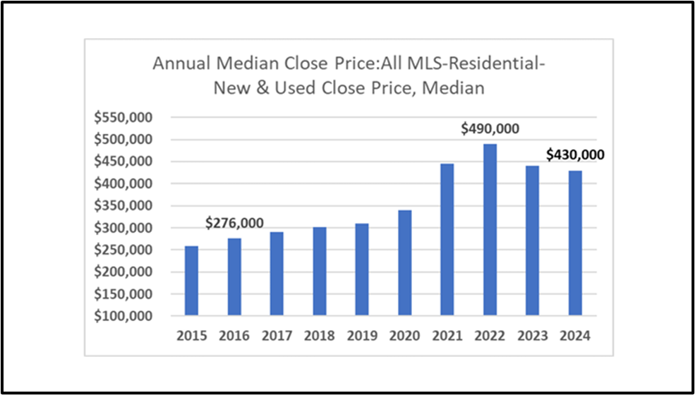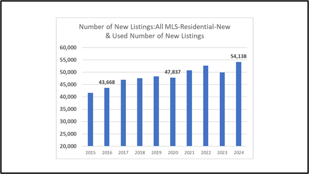 As the total number of homes sold declined by more than 23% from 2021 through 2024, the number of listings added to our inventory has grown annually. The number of new listings in 2024 was the highest in the ten years shown, while the number of closed sales in 2024 was still lower than the total in 2018!