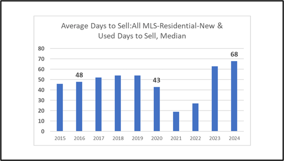 As that imbalance grew in recent years, the “days on market” for closed sales soared from less than 20 days in 2021 to almost 70 days in 2024: